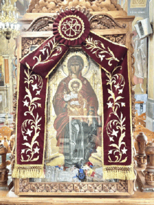 Δέσποινα καὶ μήτηρ τοῦ Λυτρωτοῦ, δέξαι παρακλήσεις, ἀναξίων σῶν ἱκετῶν, ἵνα μεσιτεύσης πρὸς τὸν ἐκ σοῦ τεχθέντα. Ὧ Δέσποινα, τοῦ κόσμου γενοῦ μεσίτρια.